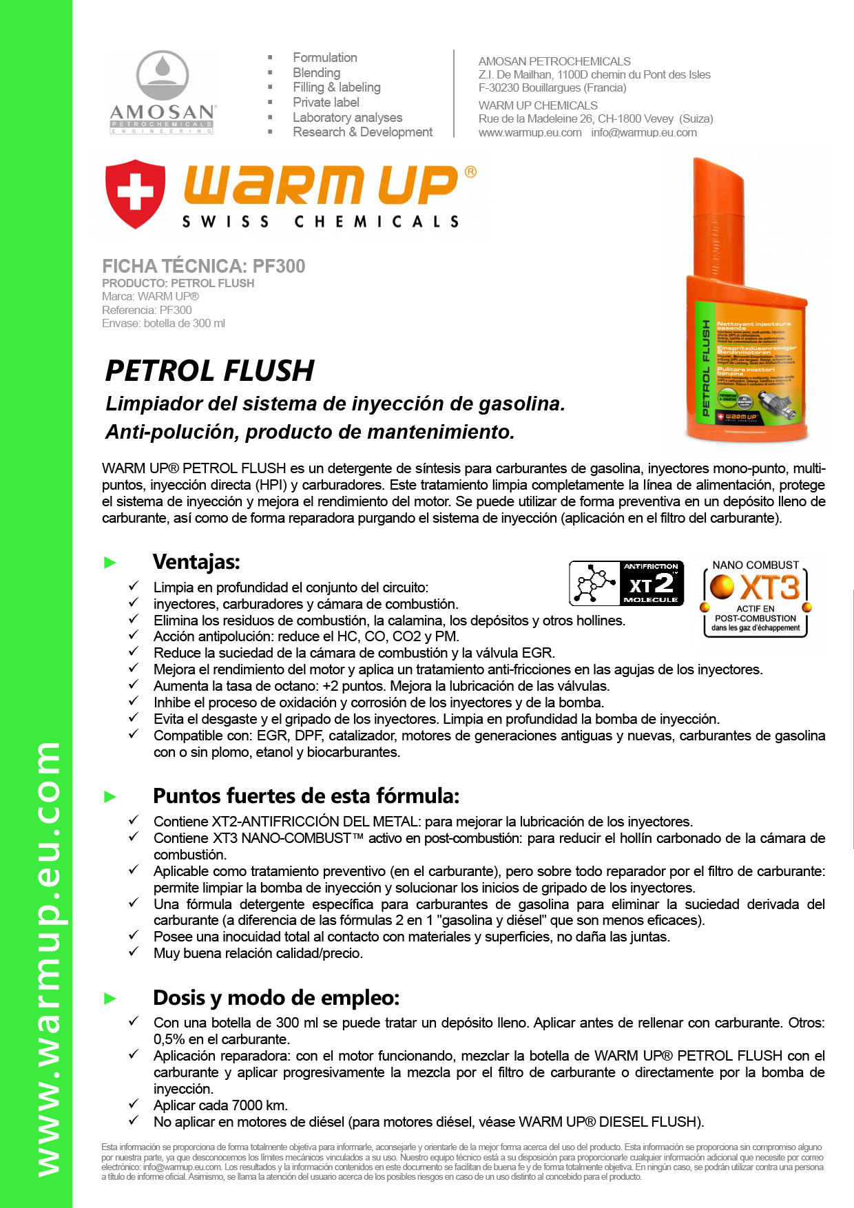 WARM UP® PETROL FLUSH est un détergent de synthèse pour carburants essence, injecteurs mono-point, multipoints, injection directe (HPI), carburateurs, anciennes et nouvelles générations. Ce traitement permet un nettoyage complet de la ligne d’alimentation, une protection du système d’injection et une amélioration des performances moteur.