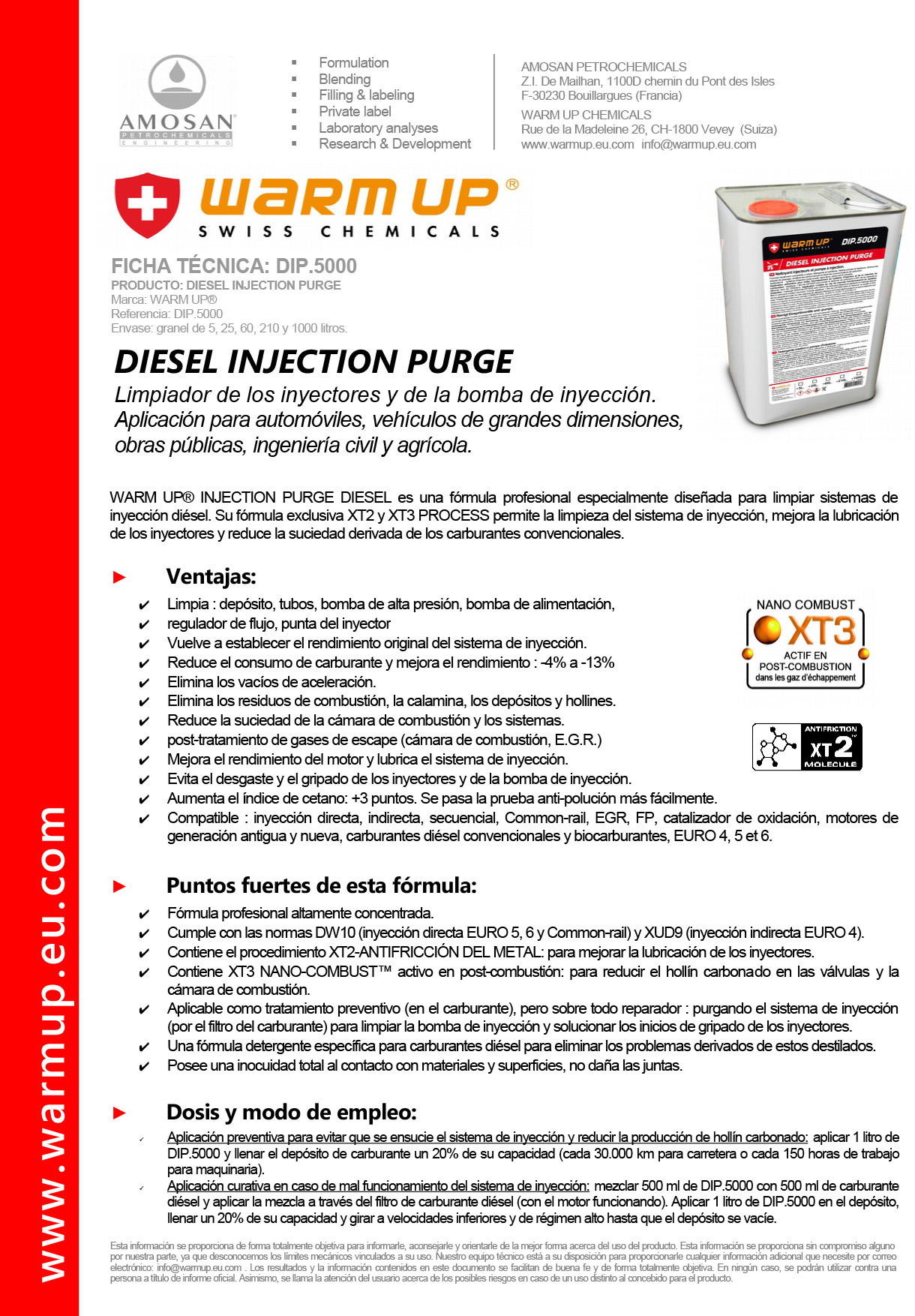 WARM UP® DIESEL INJECTION PURGE est une formule professionnelle spécialement développée pour le nettoyage des systèmes d'injection diesel. Sa formule exclusive XT2 et XT3 PROCESS permet de nettoyer le système d'injection, d'améliorer la lubrification des injecteurs et de réduire les encrassements liés aux carburants conventionnels.